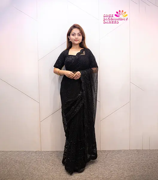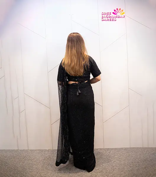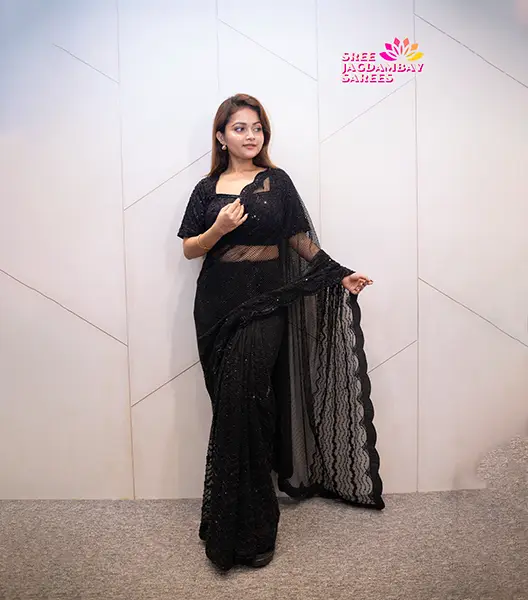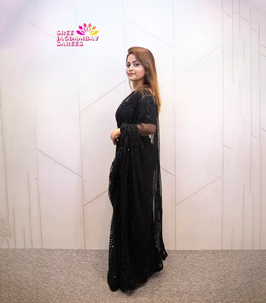 Design a timeless look with this exquisite black saree from Shree Jagdambay Sarees. Crafted with premium fabric, it features intricate lace patterns and a sheer, flowing pallu that adds a touch of modern sophistication. The blouse is designed to complement the saree perfectly, offering both style and comfort. Ideal for weddings, festive celebrations, or evening parties, this saree makes a striking statement while keeping you comfortable throughout. Its versatile black shade makes it an easy pairing with statement jewelry or accessories. No wonder it is a must-have for every wardrobe. Experience effortless glamour and contemporary style with a saree that blends craftsmanship and modern design.